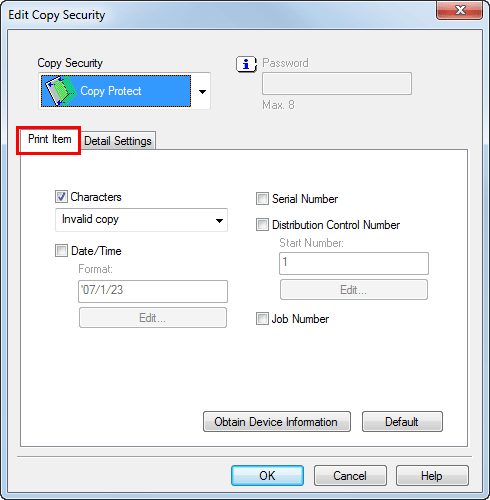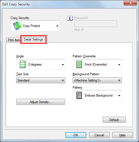 On the [Stamp/Composition] tab, select the [Copy Security] check box, and then select [Password Copy].
