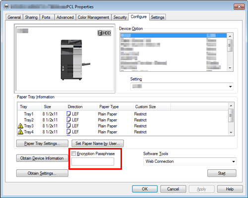 • If OpenAPI communication is SSL-encrypted and the device information can be automatically obtained from the printer driver, the encrypted passphrase can be obtained from this machine. For details on how to encrypt OpenAPI communication with SSL, refer to Here.