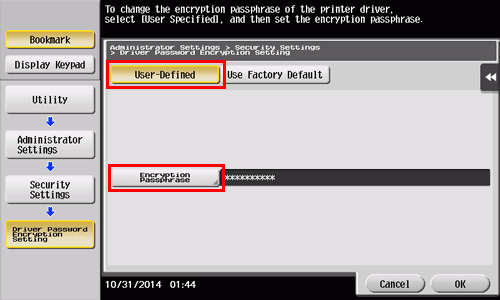 When printing is executed, some functions may send an authentication password such as the user password or account password. The password is encrypted using the encryption passphrase specified in advance in this machine. However, you can change the encryption passphrase when necessary.