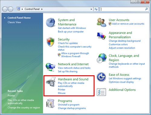 • In Windows Server 2008, click the Start menu, then click [Control Panel] - [Hardware and Sound] - [Printers].