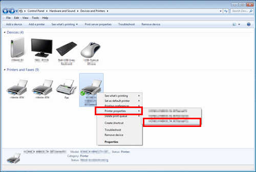 • In Windows 7/8.1/10/Server 2008 R2/Server 2012/Server 2012 R2/Server 2016, right-click the icon of the installed printer, and from [Printer Properties], click the displayed printer name.