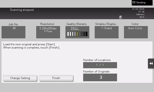 After all originals have been scanned, tap [Finish] and press the Start key.