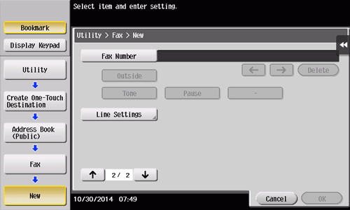Tap [Utility] - [One-Touch/User Box Registration] - [Create One-Touch Destination] - [Address Book] - [Fax] - [New].