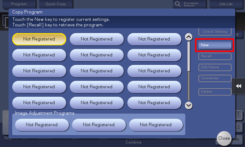 Program is a function used to register a combination of various copy settings as a recall key. The program to be registered in the copy mode is called copy program.