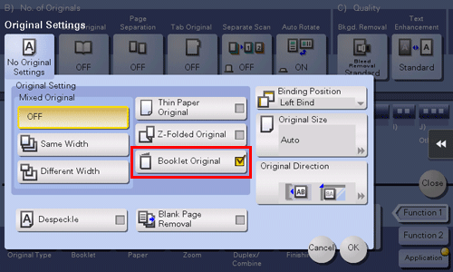 Tap [Application] - [No. of Originals] - [Original Settings], and select [Booklet Original].
