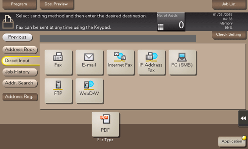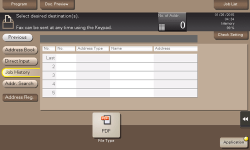 Tap [Job History], and you can select a destination from the scan or saved job history.