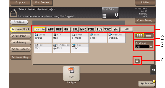 2 | Switches the display of the registered destinations to the button or list view mode. If the list view mode is selected, you can sort destinations by registration number, destination type, or registered name. |