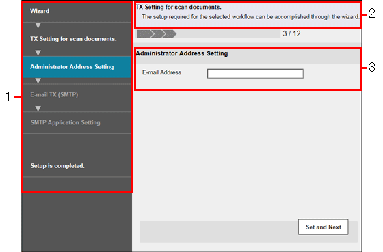 1 | Flow | Displays the setting flow. The current setting item is displayed in dark gray by which you can confirm the setting flow step you are in. Click one of the previous setting items to return to it and redo settings. |