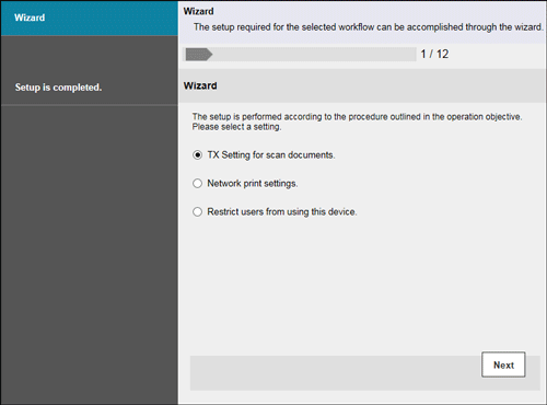 To configure settings using the wizard, log in to the administrator mode, then select [Wizard].