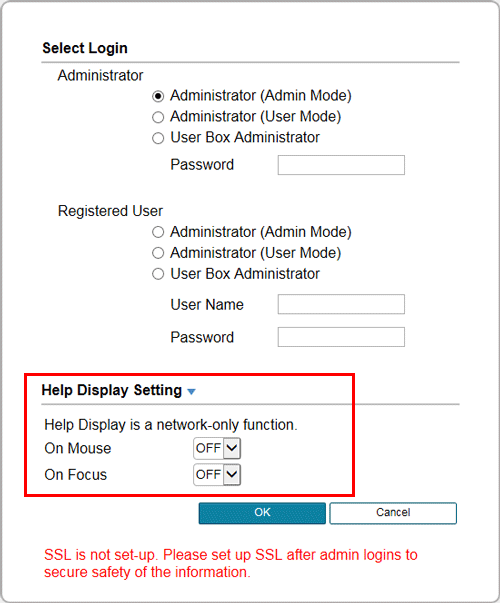 In the screen to log in to the administrator mode, you can specify the method to display the popup help.