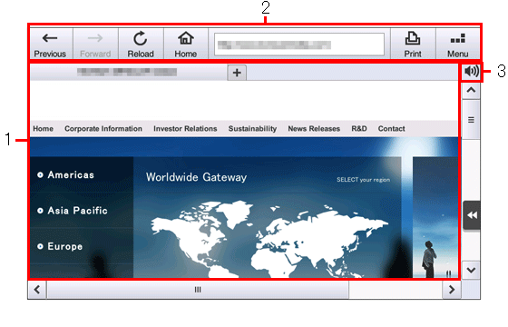 2 | Toolbar | Tapping an icon on the toolbar moves and reloads a page, or displays and adds a favorite. If you enter a URL into the address entry field, you can directly visit a page at the specified URL. The toolbar supports Web browser settings. For details on the toolbar, refer to Here. |