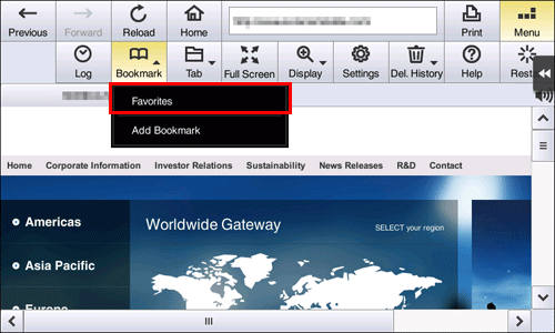 Tapping [Menu] - [Bookmark] - [Favorites] on the toolbar displays a list of favorites registered on this machine.