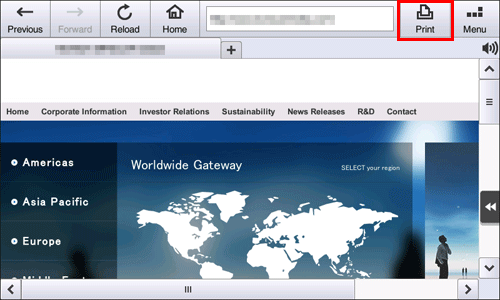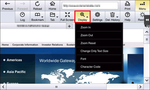 [Character Code] | Change the character code. The character code select screen is grouped for each region, which is to be displayed. If any garbled characters are detected, specify any character code, then switch the display of the Web page to deal with such an error. |