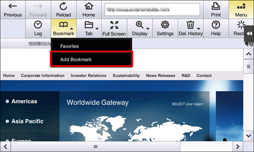 Display a page to be added as a favorite, then tap [Menu] - [Bookmark] - [Add Bookmark].