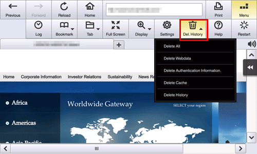 Select [Menu] - [Del. History] on the toolbar to delete Web data (Cookie, Web Storage, or Indexed Database), cache data, authentication information, and other information.