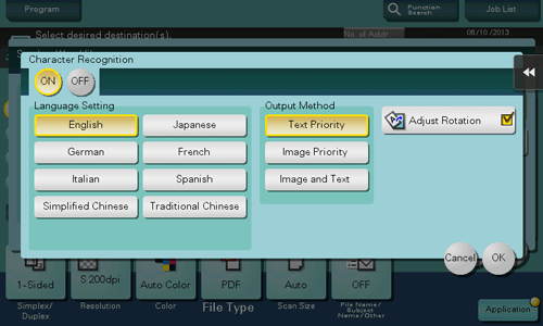[Adjust Rotation] | Select this check box to automatically perform the rotation adjustment for each page based on the direction of text data detected by OCR processing. When the rotation adjustment is disabled, if the specified original orientation does not match the text direction, text data is not recognized correctly. | |