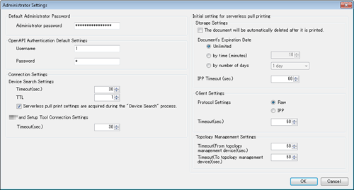 • [Device Search Settings]: Specify the timeout and TTL (Time To Live) to search for an MFP using LK-114_SetupTool. To obtain serverless pull printing settings simultaneously when searching for an MFP, select the [Serverless pull print settings are acquired during the "Device Search" process.] check box.