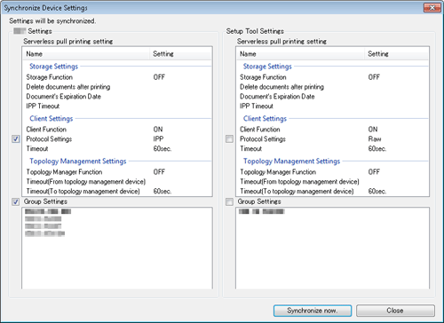 This displays serverless pull printing settings of LK-114_SetupTool and the MFP, and also displays the check box for all items that have different settings.