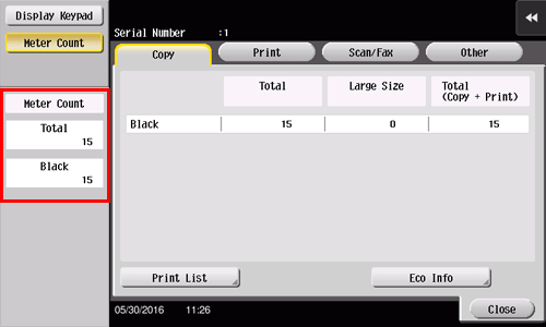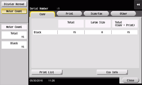 Allows you to check the total number of pages copied. (This value includes the number of pages on which data saved in a User Box in copy mode is printed, and the number of pages list-output in [Administrator Settings].)