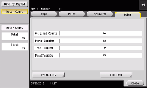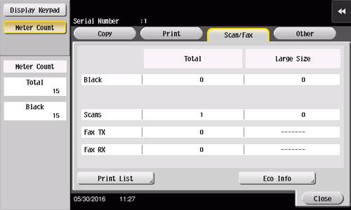 Check the total number of original pages scanned in the Scan/Fax or User Box mode as well as the total number of pages on which a file in a User Box or a received file is printed. Also check the total number of pages sent and received in the fax mode.