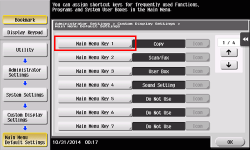 1. Tap [Utility] - [Administrator Settings] - [System Settings] - [Custom Display Settings] - [Main Menu Default Settings].