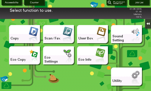 When one of [Eco Settings], [Eco Copy], and [Eco Info] is placed on the main menu, the background of the main menu changes to that of the Eco function.
