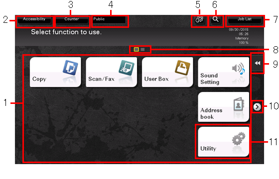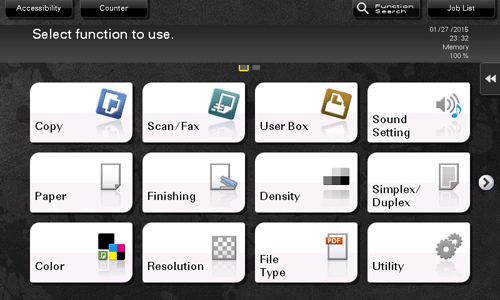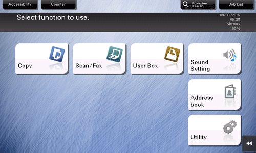 By default, [Copy], [Scan/Fax], [User Box], and [Sound Setting], [Address book], and [Utility] are arranged on the main menu. ([Utility] is fixed.)