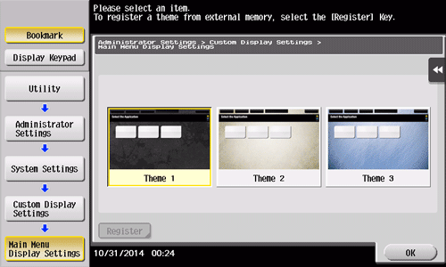 • You can register an image on this machine to use it as a theme of the main menu. Up to three files can be registered as images. To register a theme, connect the USB memory device, which contains the target theme, to this machine, then tap [Register].