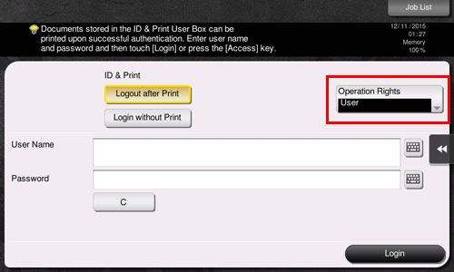 • If you select [Administrator] or [User Box Administrator] in [Operation Rights] to log in, it cancels the functional restrictions and the maximum number of printed sheets that are set to the registered user.