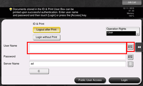 If authentication succeeds, you can log in to this machine. The user name is displayed on the top section of the screen during the login process.