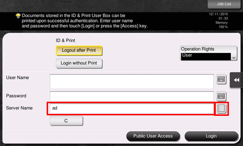 Enter the user name and the password, and select a server to be authenticated. The contents of the Login screen may vary depending on the authentication setting of this machine.