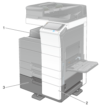 1 | Heater Power Switch | Used to turn Heater operations on or off. This function prevents paper from being affected by humidity when the power is turned on. The dehumidifier Heater is available when you purchase Single/Double Paper Feed Cabinet, LCT (built-in), Desk, or Large Capacity Unit. To use the Large Capacity Unit, the Transformer kit TK-101 is required separately. |