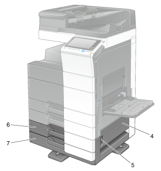7 | Tray4/Storage Box | Used as a Storage Box when installing Single Paper Feed Cabinet. This box allows you to load up to 500 sheets when Double Paper Feed Cabinet is installed. This tray can hold up to 150 sheets of Thick 1, Thick 1+, Thick 2, and Thick 3. |