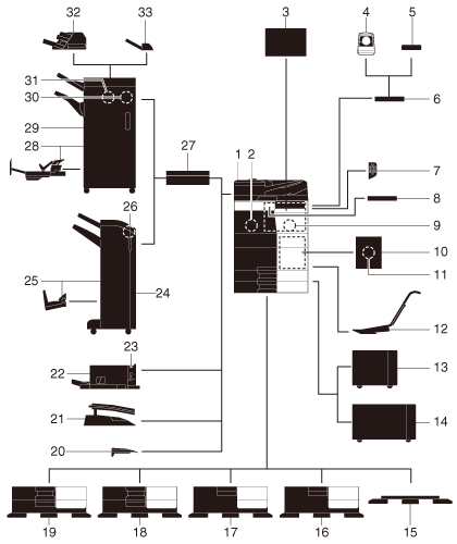 22 | Finisher FS-533 | Install this unit onto the output tray of this machine. Sorts, groups and staples printed paper before outputting it. This unit can only be installed in the bizhub 558e/458e. |