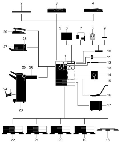 23 | Finisher FS-536 | Sorts, groups and staples printed paper before outputting it. To install the Finisher FS-536, the Relay Unit RU-513 is required. Also, Desk DK-510, Paper Feed Cabinet PC-415, Paper Feed Cabinet PC-115, or Paper Feed Cabinet PC-215 must be installed on this machine. |