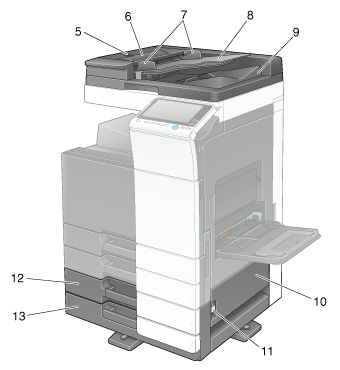 13 | Tray4/Storage Box | Used as a Storage Box when installing Single Paper Feed Cabinet. This box allows you to load up to 500 sheets when Double Paper Feed Cabinet is installed. This tray can hold up to 150 sheets of Thick 1, Thick 1+, Thick 2, and Thick 3. |