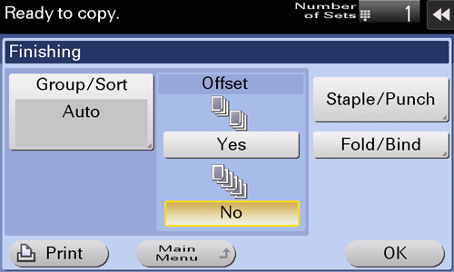 [Offset] | Select [Yes] when sorting by copies or by page to feed out paper. If the Finisher or Job Separator JS-506 is installed, the copies are fed out and stacked on top of each other with each copy or page set staggered to separate them. If no Finisher or Job Separator JS-506 is installed, printed copies are fed out and sorted in an alternating crisscross pattern when the following conditions are satisfied.