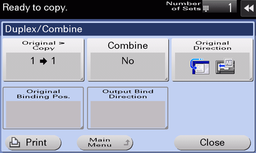 [Original > Copy] | Select a combination of the original to be loaded (1-sided original or 2-sided original) and the copy method (1-sided copy or 2-sided copy). To scan a 2-sided original, specify whether to set the original to Top Bind or Left Bind/Right Bind in [Original Binding Pos.] To make a 2-sided copy, specify whether to set a copy to Top Bind or Left Bind/Right Bind in [Output Bind Direction]. |