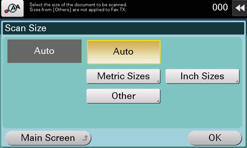 There are various scan sizes, for example, [Auto] that fits the original size, [Inch Sizes], and [Metric Sizes].
