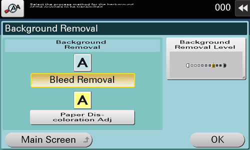 [Background Removal Level] | Tap this button to adjust the density of the background color for an original with a colored background. Selecting [Auto] automatically determines the density of the background color, and scans an original at the optimum background density level. |
