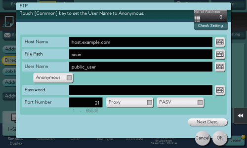 Enter a destination FTP server host name or IP address when scanned original data is sent to a FTP server.