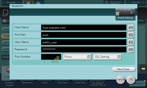 Enter a destination WebDAV server host name or IP address when scanned original data is sent to a WebDAV server.