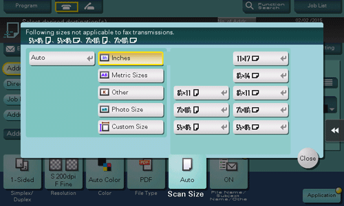 [Inches] | Select this option to scan an inch-size original. Tap [Inches], and select a standard inch size. |