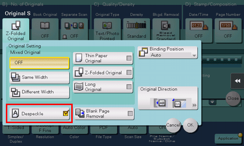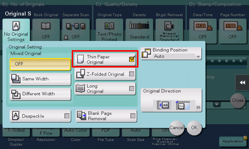 [ON]/[OFF] | Select [ON] to specify Book Original. |
