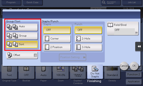 [Auto] | Automatically switches between Sort and Group according to the number of printed sheets for each set, and feeds out. If the number of printed sheets for each set is 1, the Group function is applied. If the number is 2 or larger, the Sort function is applied. |