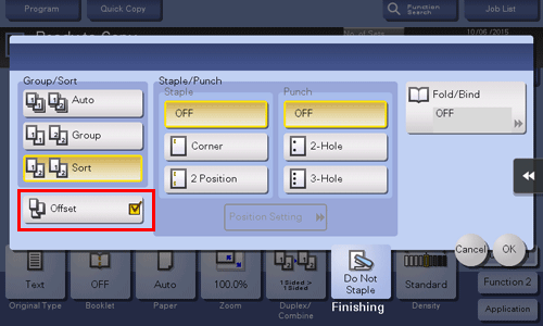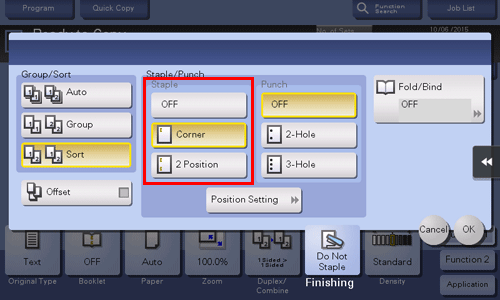 [Position Setting] | Select the punch position and original loading direction. If [Auto] is specified for the punch position, the punch position is determined automatically based on the direction of the loaded original. |