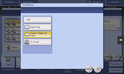 [Fold/Bind] | Staples copy outputs in the center the paper or fold them in the center before discharging.