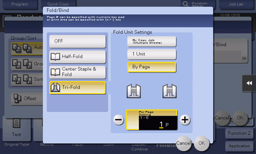Feeds out a copied sheet by folding it in three. Also select the unit by which the paper is folded from [By Copy Job (Multiple Sheets)], [1 Unit], and [By Page]. When you set [By Page], specify the number of pages to be folded at one time.