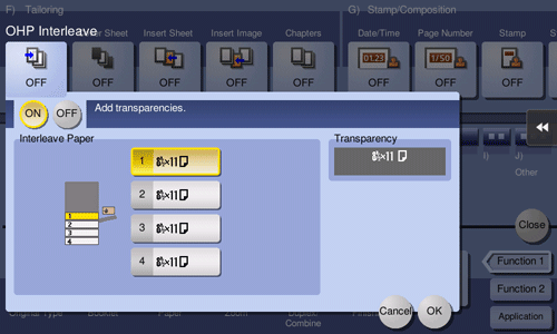 [Interleave Paper] | Select the paper tray for the paper to be inserted between transparencies. The paper size of the transparencies loaded on the Bypass Tray is displayed in [Transparency]. Be sure to use the same size for loaded transparencies and the paper to be inserted. |