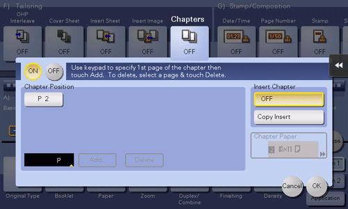 [Chapter Paper] | If [Insert Chapter] is set to [Copy Insert], select the paper tray where the Chapter Paper is stacked. If the chapter paper and text paper differ, use the same size of paper and stack them in the correct direction. |